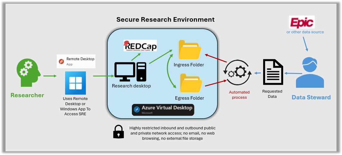 Once inside the SRE, researchers can utilize tools such as REDCap, SAF, Excel, Python, R Studio, and others. They can also access authorized data through the designated Ingress Folder.
